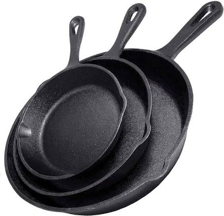 3 piece set, cookware set 6, 8, 10 Inches, Cast iron for frying, saute, &more, easy use in the oven, stove, grill, or campfire, black, with silicone heat-resistant cover