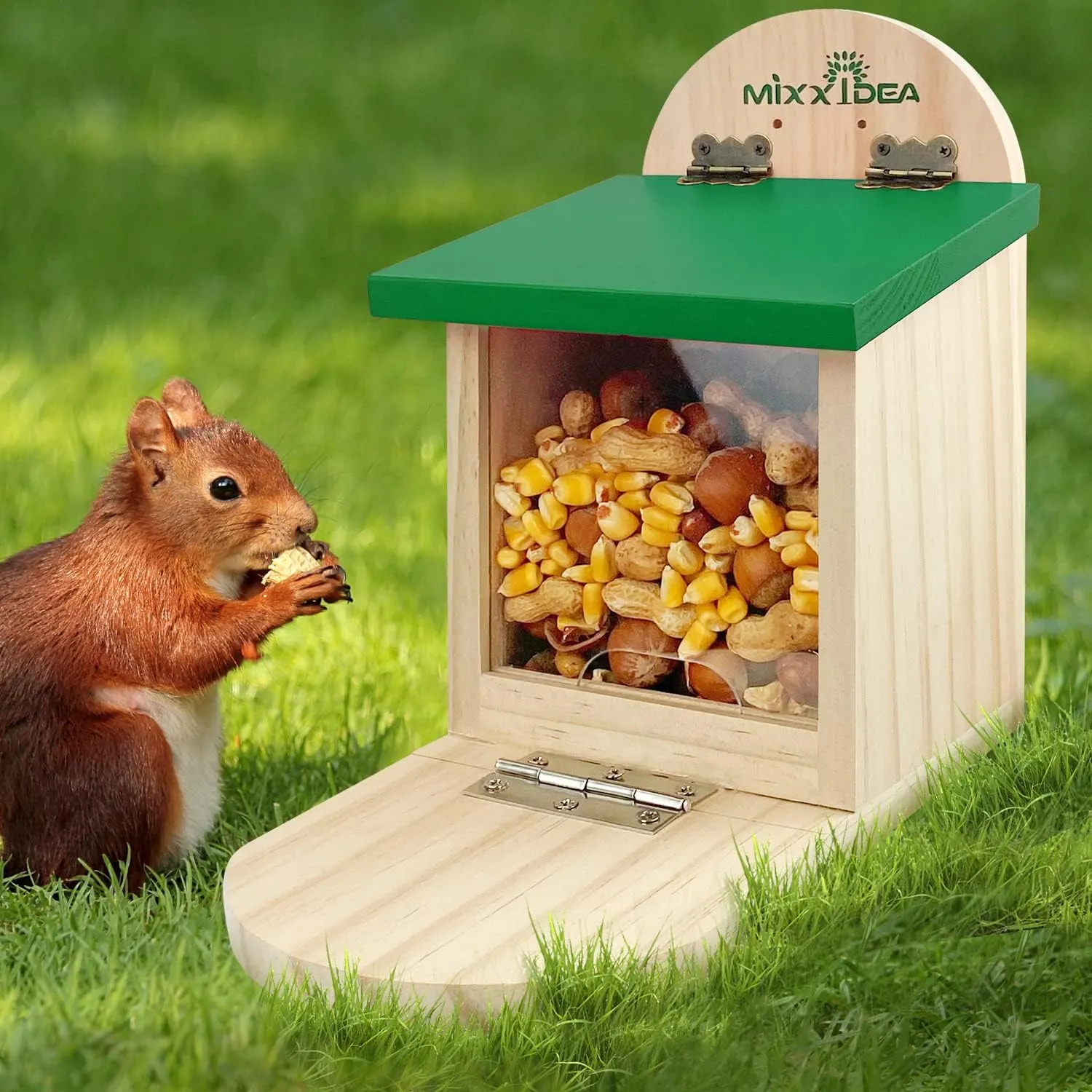 • Sturdy Construction : For durability, we built this squirrels feeder with sturdy thick wood and thick screws. The bottom and roof are treated with additional reinforcement screws. Even in bad weather, this squirrel feeder performs well. Equipped with two large metal hinges, the bottom of the feeder has a good weight capacity. It can withstand multiple squirrels at the same time