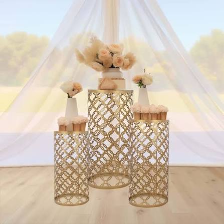 Urban Deco Cylinder Stands for Party, Set of 3 Gold Metal Hexagon Cake Pedestal Stand with Marbled Countertop, Flower Plant Pedestal Stands for Display Parties Wedding Birthday Decor, 3PCS, Gold